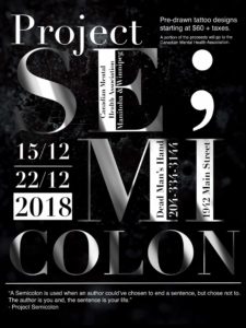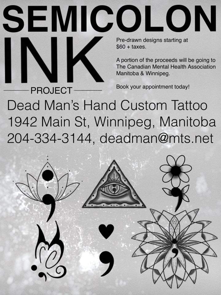Dead Man’s Hand Tattoo Shop is running their second Project Semicolon from December 15th -22nd, 2018. Last time, The Dead Man’s Hand Tattoo Shop donated over $6000.00 to the Canadian Mental Health Association Manitoba and Winnipeg