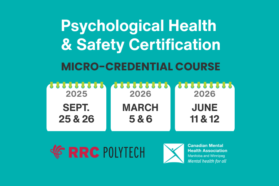 Take the lead in workplace wellness. Register for the CMHA Manitoba and Winnipeg and RRC Polytech Certified Psychological Health & Safety Micro-credential. The next course runs September 25 & 26. Register by September 5.